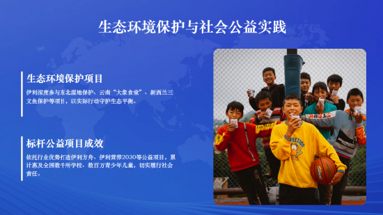在生态保护领域,伊利参与东北湿地保护、云南“大象食堂”、新西兰三文鱼保护等项目,以实际行动守护生物多样性;在公益实践中,打造伊利方舟、伊利营养2030等标杆项目,惠及全国数千所学校、数百万青少年儿童。