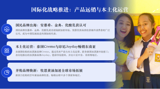 在本土化运营上,伊利收购泰国冰淇淋品牌Cremo,跻身当地市场前三;推出印尼品牌Joyday,稳居市场前四并出口中东、非洲;新西兰百年黄油品牌牧恩,畅销全球20多个国家和地区。安慕希、金典、优酸乳等国民品牌也成功登陆新加坡,获得海外消费者认可。